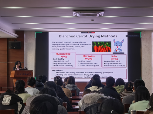讲座中,Sangeeta副教授以自身学习与科研经历为主线,分享了在不同研究阶段围绕食品加工技术开展的研究与心得体会,结合具体的研究案例,阐述了加工方式对食品品质与功能特性的影响。同时,她还分享了在食品企业工作的实践经历,为学生在职业规划方面提供了启示。最后,Sangeeta副教授从教学、科研与学术服务三个方面,全面展示了一名高校教师的多重角色与责任。她重点介绍了所在团队目前开展的四个主要研究方向,包括食品3D/4D打印技术、食品口腔加工与消化行为、功能食品开发,以及食品微观结构。她系统阐述了食品结构设计在改善感官体验、提升营养利用效率及满足特殊人群需求方面的重要意义。